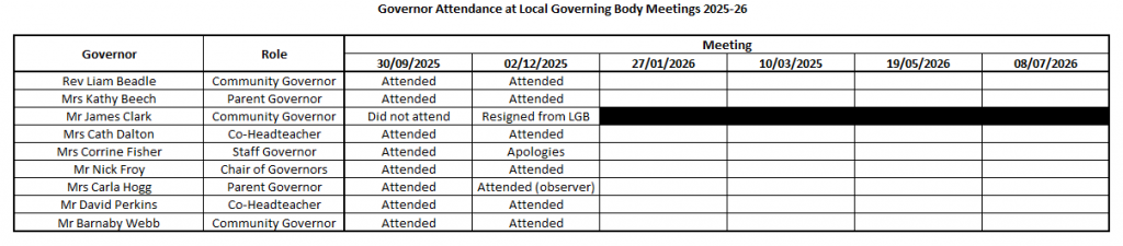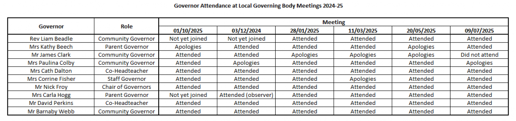 - attendance records at governing body meetings over the last academic year.